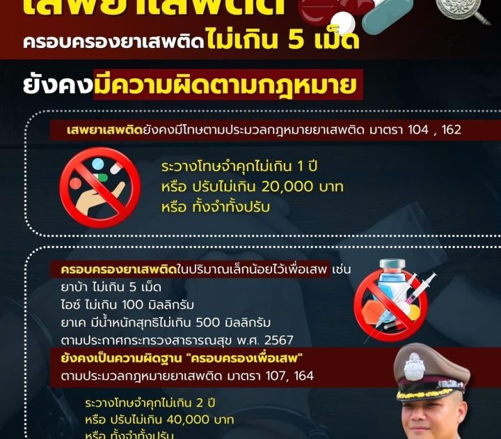 📣การเสพยาเสพติด การครอบครองยาเสพติดไม่เกิน 5 เม็ด ยังคงมีความผิดตามกฎหมาย มีโทษทั้งจำทั้งปรับ!! 🚨